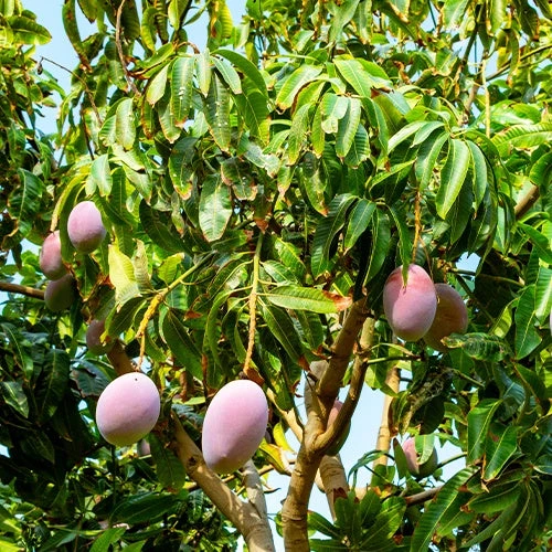 La floraison du manguier est très abondante et agréablement parfumée. Une partie des fleurs tombent prématurément et d’autres restent, parmi lesquelles certaines seront fécondées pour produire des fruits à déguster crus, en salades ou incorporés dans de délicieux mets aux goûts des tropiques. Le manguier est un arbre fruitier qui produit des fruits qu’après sa sixième année de culture. Température minimale de conservation : 15 °C.